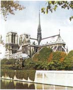 1163-1250年,法蘭西早期哥特建筑的典型實例,位于巴黎城中。入口西向,前面廣場是市民的市集與節日活動中心。教堂平面寬約47米,深約125米,可容近萬人。東端有半圓形通廊。中廳很高,是側廊(高9余米)的三倍半。結構用柱墩承重,使柱墩之間可以全部開窗,并有尖券六分拱頂,飛扶壁等。正面是一對高60余米的塔樓,粗壯的墩子把立面縱分為三段,兩條水平向的雕飾又把三段聯系起來。正中的玫瑰窗(直徑13米)西側的尖券形窗,到處可見的垂直線條與小尖塔裝飾都是哥特建筑的特色。特別是當中高達90米的尖塔與前面的那對塔樓,使遠近市民在狹窄的城市街道上舉目可見。