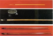 當時的毛筆制做方法是:將筆桿的一頭分成幾片,筆的毛夾在它的中間,然后用細線纏住,再在筆桿的外面涂上一層漆。