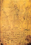 同年,曹元忠還請匠人雕印了《大圣天王像》,其形式也為上圖下文,構(gòu)圖更為復(fù)雜。在后晉天福五年(公元940年),曹元忠還請匠人雕印了《金剛經(jīng)》。曹元忠刻印的還有《圣觀自在菩薩像》。還有一幅現(xiàn)在北京圖書館收藏的《大圣文殊師利菩薩像》,和曹元忠刻印的其它幾幅佛像風(fēng)格相近,據(jù)推斷也可能是請人刻印的。所以,在敦煌曹元忠組織工匠刻印了較多的佛像佛經(jīng),這在五代印刷史上,應(yīng)占有一定地位。