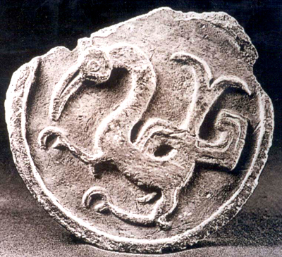 陜西西安出土。戰國。泥質灰色。圓形,邊輪內飾鳥紋。圓眼特大,喙細長,頸彎曲,身軀瘦削,翅尾上翹,勾形爪前伸有力。從長喙修腿看似食魚鳥類。