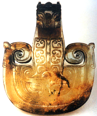 山東曲阜魯國故城出土。戰國。黃色,有浸痕。呈鏟形,鉤身飾獸面紋,雙眼突出,長眉上卷,左右和脊背用陰線刻出卷曲紋、花形紋、卷云紋等。鉤端作回首獸頭狀。背面圓形鈕,并飾菱形紋、勾云紋等。形制特殊,雕鏤精巧。