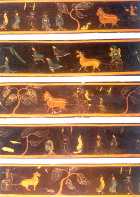 湖北荊門包山出土。戰國中期。畫面用土黃、桔紅、海藍、棕四色繪于漆奩之上,有人物26個,驂車(三馬駕車)、駢車(二馬駕車)各兩乘,大雁9只,狗2只,豬1頭,樹5棵,構成一幅聘禮行迎圖。畫面用樹木分隔為5段,又以犬為間隔,按其情節分為兩大部分。一部分以奔馳的車馬、冕冠垂纓的乘人、襦衣青幘的隨從及拜接者組成,表現的是一派聘問出行途中的景象。另一部分則由氣宇軒昂的褒衣博帶者與待發的駢車為主體,表現的是一幅主國出使迎賓的場面。此畫繪于漆奩蓋部的外壁,出土后與夾纻胎分離。畫中的驂車和胼車為研究戰國的馬車型制提供了重要的資料。