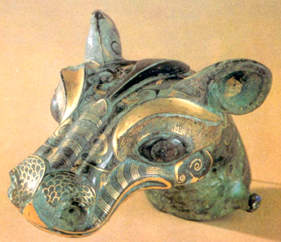 河南輝縣固圍村出土。戰國中晚期。作獸首形,無角,錯金銀,以云紋為地。固圍村大墓屬魏國,有陵園,與河北平山三汲中山王墓類似,時代亦相接近。墓經盜掘,遺物不多,這件轅飾的錯金銀技藝與中山王墓所出器物頗近似。